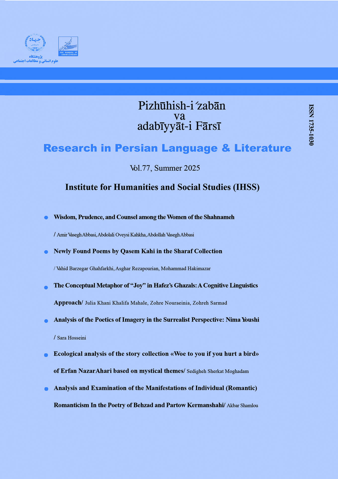 List of Articles Open Access Article Abstract Page Full-Text 1 - Analysis and Examination of the Manifestations of Individual (Romantic) Romanticism In the Poetry of Behzad and Partow Kermanshahi akbar shamloo Open Access Article Abstract Page Full-Text 2 - Newly Found Poems by Qasem Kahi in the Sharaf Collection vahid bargegar ghahfarrokhi asghar rezapurian mohammad hakimazar Open Access Article Abstract Page Full-Text 3 - The Conceptual Metaphor of “Joy” in Hafez’s Ghazals: A Cognitive Linguistics Approach julia khani khalife mahalle zohre nouraeenia zohreh sarmad Open Access Article Abstract Page Full-Text 4 - Analysis of the Poetics of Imagery in the Surrealist Perspective: Nima Youshij sara hosseini Open Access Article Abstract Page Full-Text 5 - Ecological analysis of the story collection «Woe to you if you hurt a bird» of Erfan NazarAhari based on mystical themes Sedigheh Sherkat Moghadam